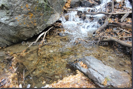 There is a rock leaning against the hill that offers a nice alcove next to the waterfall. You used to be able to get in without getting too wet, but the water course seems to have changed a bit. Still neat.