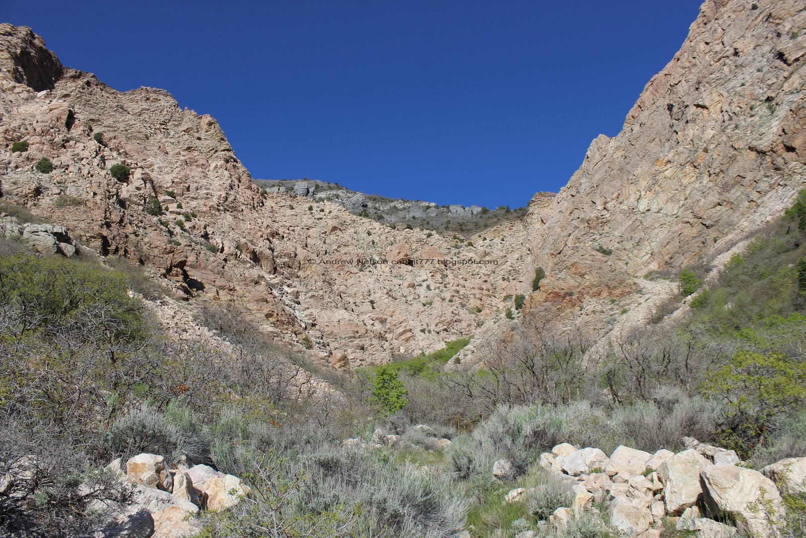 Just after the 2nd bridge, which is almost exactly a mile up, you will reach the spur trail into the canyon. The sign says waterfall (in season). This is an ephemeral waterfall, or seasonal waterfall. meaning it only lasts for a little while. Most ephemeral waterfalls only go during run-off, like Ghost Falls and others only after a good rainfall examples of those can be seen in places like Zion and we saw traces of some in Rock Canyon.