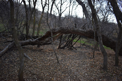 The creek bed, dry after being diverted. The bikes cruising down across this bridge made an awfully loud noise.
